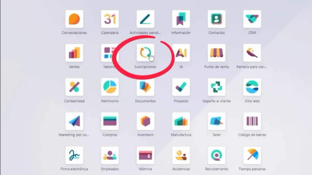 Desde el menú principal de Odoo se accede al módulo de Suscripciones, donde se concentra toda la información relacionada con servicios recurrentes