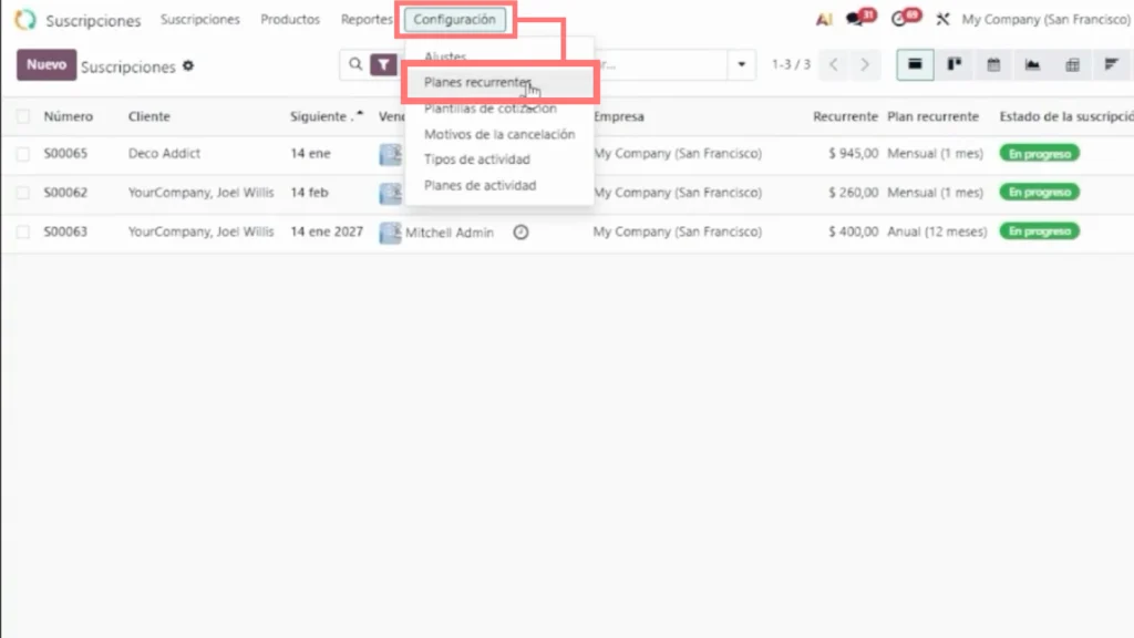 El módulo de Suscripciones de Odoo permite administrar servicios con planes recurrentes desde una sola plataforma, manteniendo visibilidad sobre los planes, los clientes y la facturación.