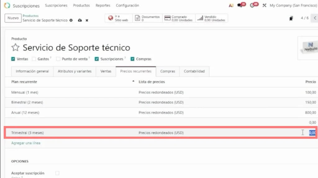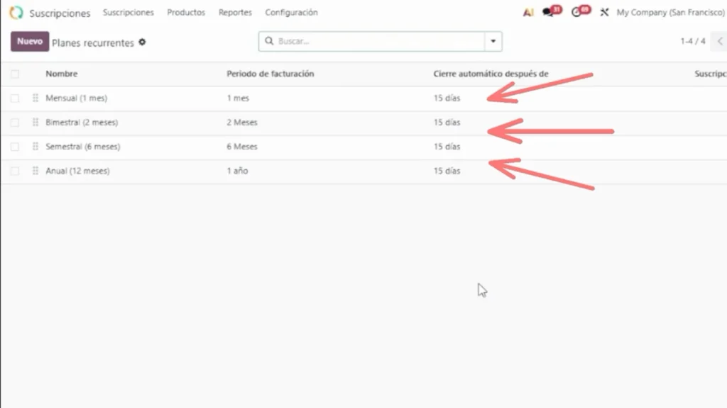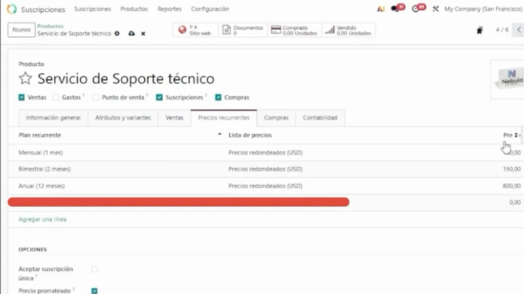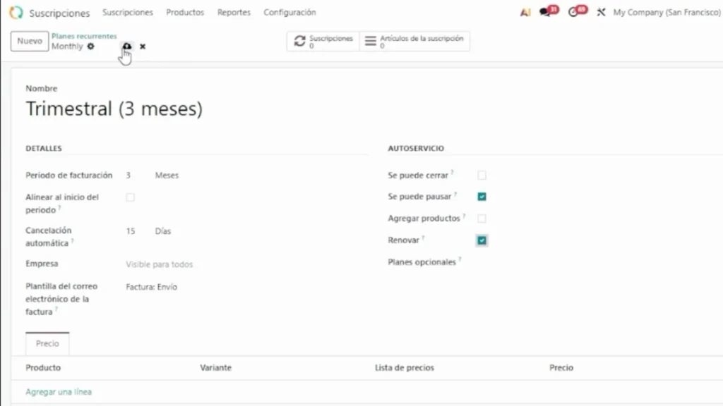 Cada plan recurrente se vincula a un producto o servicio dentro de Odoo, donde se definen los detalles de lo que se ofrece al cliente.
